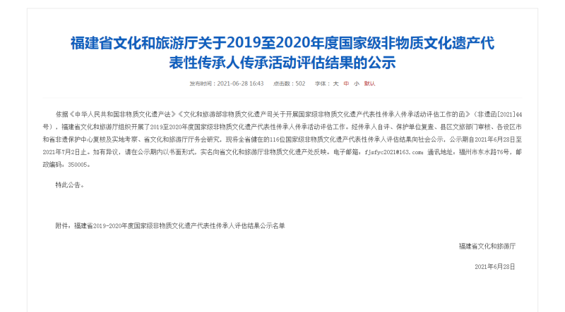 依據(jù)《中華人民共和國(guó)非物質(zhì)文化遺產(chǎn)法》《文化和旅游部非物質(zhì)文化遺產(chǎn)司關(guān)于開展國(guó)家級(jí)非物質(zhì)文化遺產(chǎn)代表性傳承人傳承活動(dòng)評(píng)估工作的函》(非遺函[2021]44號(hào)),福建省文化…