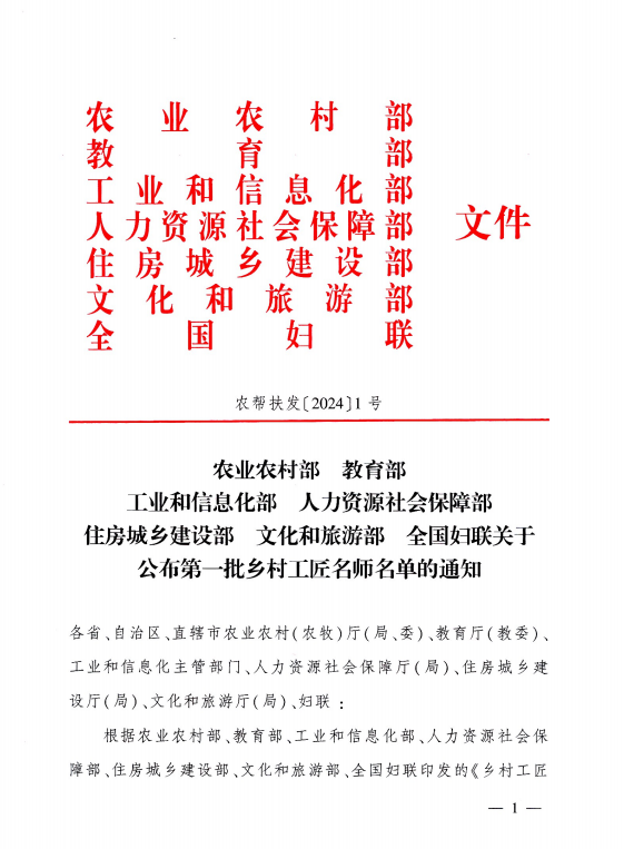 農(nóng)業(yè)農(nóng)村部、教育部、工業(yè)和信息化部、人力資源社會保障部、住房城鄉(xiāng)建設(shè)部、文化和旅游部、全國婦聯(lián)關(guān)于公布第一批鄉(xiāng)村工匠名師名單