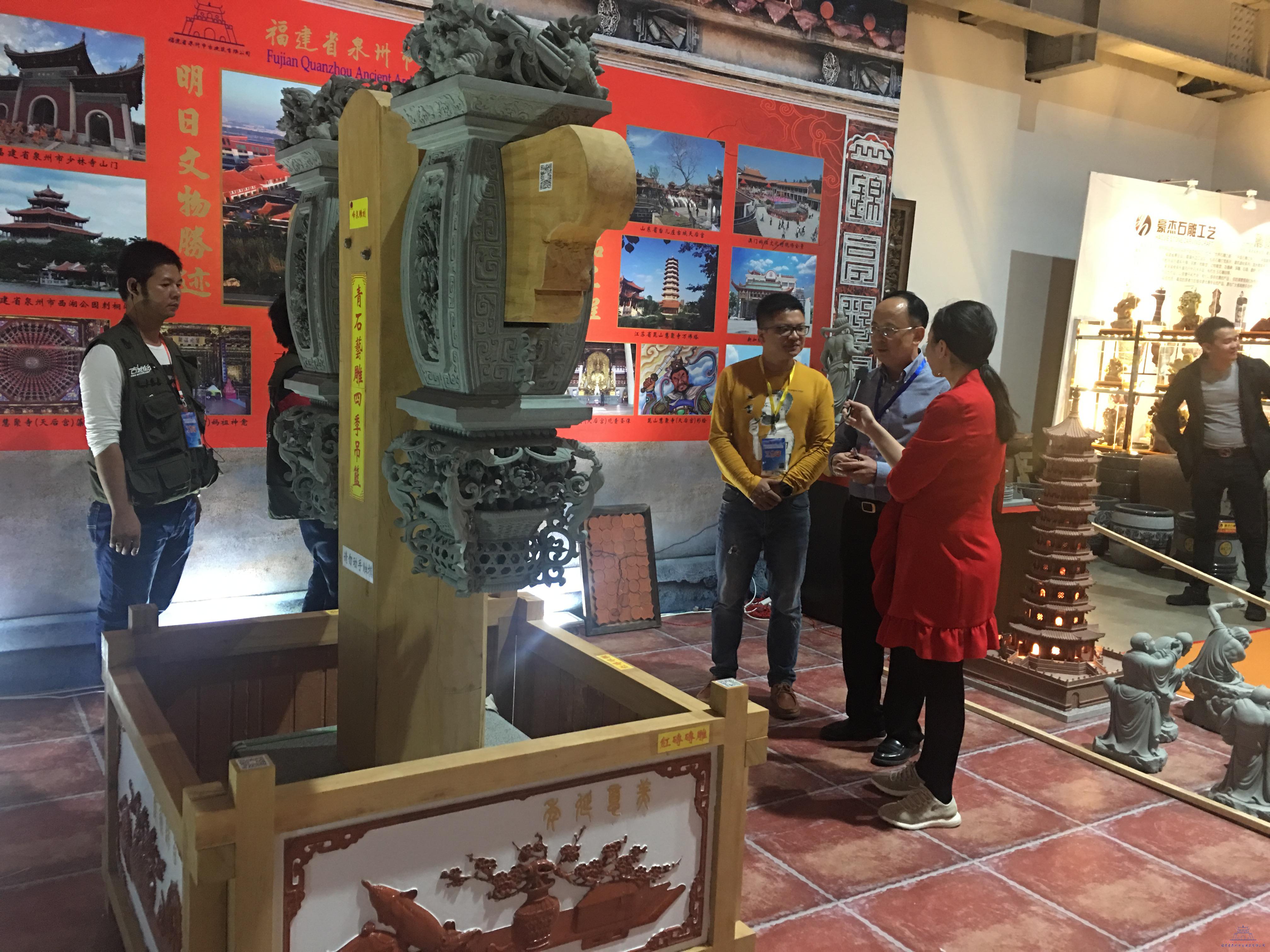 現場門庭若市,四君子吊籃雕工細致,藻井(蜘蛛結網)富麗堂皇,吸引了眾多客商的眼球,成為本屆展會的一大亮點,泉州古城在線等媒體紛紛前來采訪;且我司蔣武器石雕作品《四君子吊籃》榮獲2017年中國(惠安)國際雕刻藝術品博覽會“雕藝杯”藝術品評比金獎。