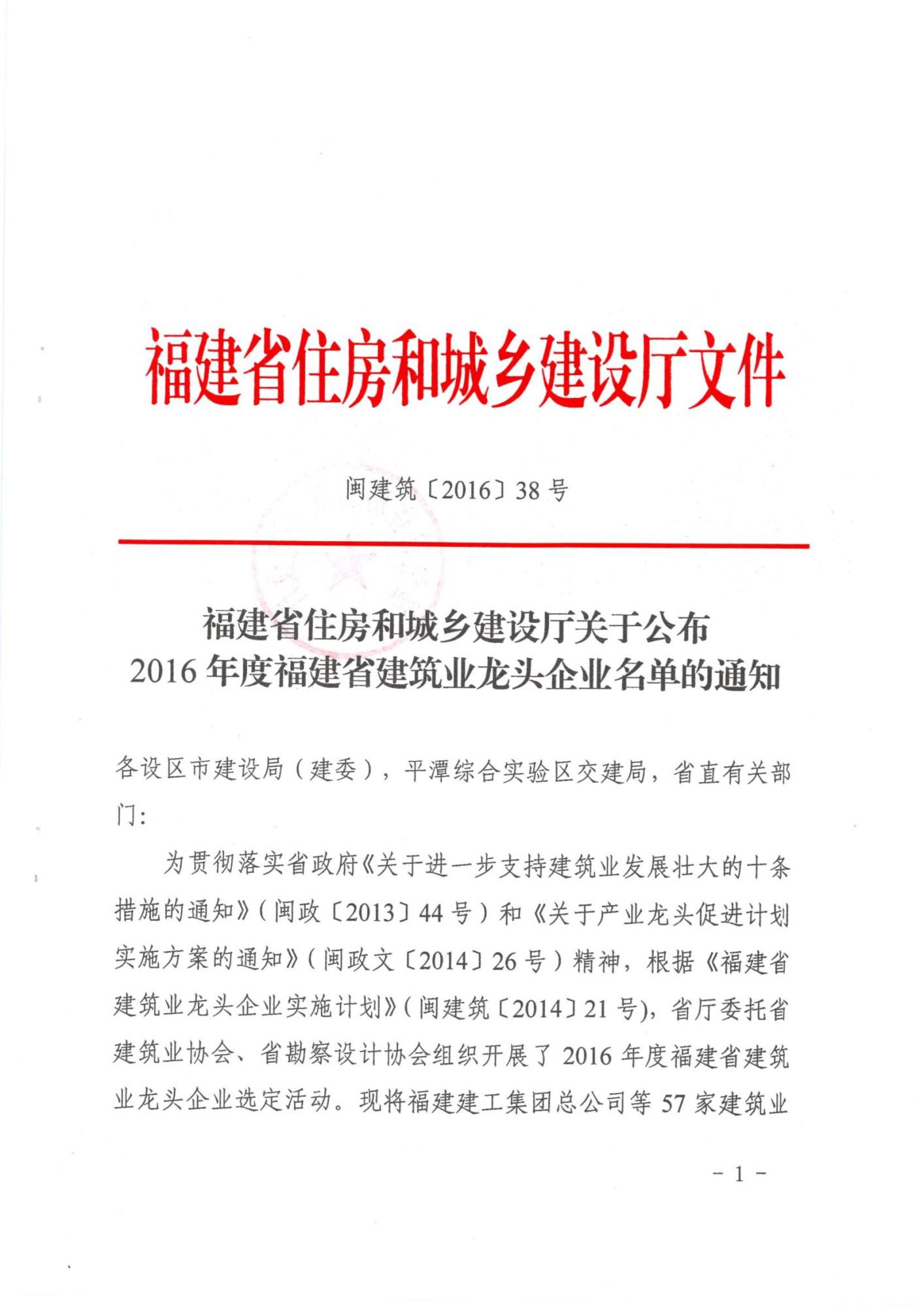 公司獲評為2016年度福建省建筑業龍頭企業
