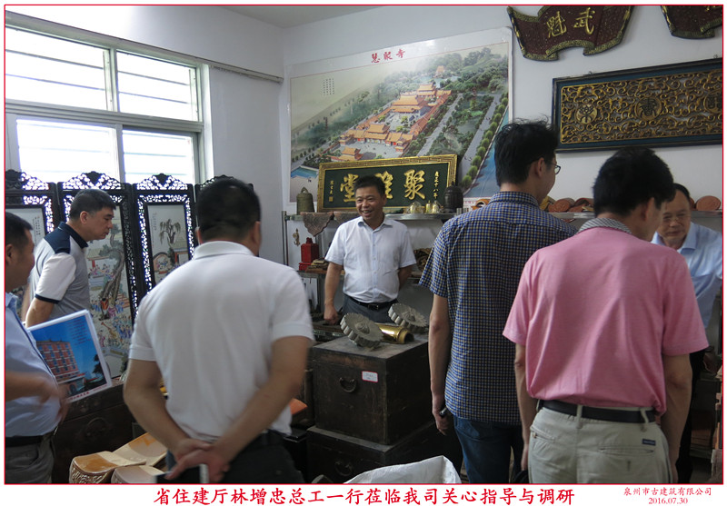 7月29日下午,福建省住建廳林增忠總工等一行蒞臨我司關心指導。首先,在公司董事長蔣欽全、副總李澤平的陪同下,參觀了辦公室及“泉州市閩南傳統民居營造技藝傳習所”展示廳。