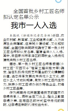 泉州一人入選全國首批鄉村工匠名師擬認定名單