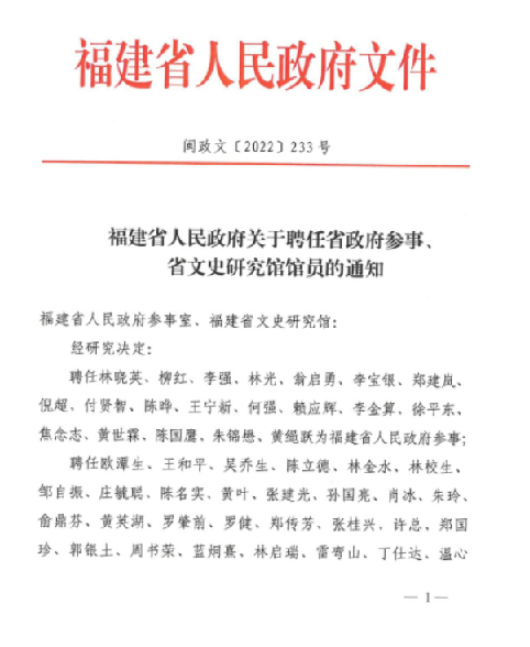 喜訊!公司董事長蔣欽全被聘為福建省文史研究館館員